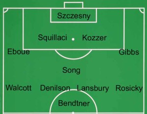 I would rest Song and I think Neamman might have predicted correctly but Nik/Theo/Carlitos as a front 3 in attack and Theo/ Nik dropping back to form a 5 in midfield in defense.