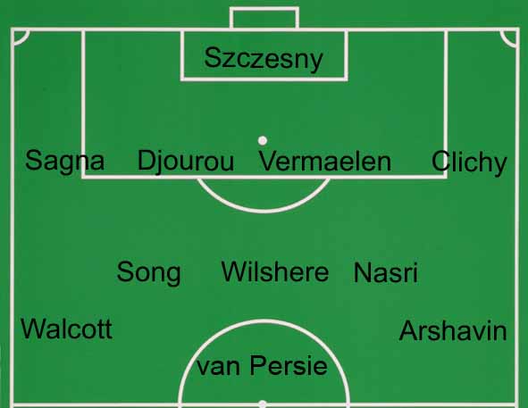 Right – off the soapbox and onto our team for today. I am hoping for a Nasri return. Losing him and Cesc at the same time massively reduces our creativity. The Ramsey/Wilshere midfield may well be the future but it is not the present, though Chamakh deserves a start following his performance last week.