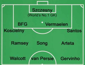 Szczesny, Koscielny, Vermaelen, Mertesacker, Andre Santos, Song, Ramsey, Arteta, Walcott, Gervinho, Van Persie.
