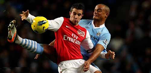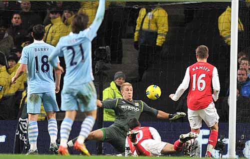 The game started pretty even, with both teams full of energy and confidence. In the 9th minute Citeh have a decent first chance: Zabaleta puts in a decent cross from the left to Aguero, who controls the ball well but then blasts the ball well over Szczesny and the goal. After that, there is more pressure by MC but Arsenal work hard as a unit and give very little space away. At this stage though, Song gets a yellow card – a very soft one – and soon after that Richards shamelessly tries to get our ‘Only Song’ booked again. A feat repeated by a few more Citeh players during the match, but referee Dowd did well not to fall into that oily trap. Arsenal struggles at the early stages to pass the ball through Citeh’s lines, and our opponents find it easier to pick an attacking through-ball. However, this changes when Song picks out a good run by Gervinho who hits a hard and low diagonal shot which Joe Hart, with an element of luck, is just able to save with his right arm. This was just what we needed to give us believe. The subsequent corner is played towards the edge of the box, where Ramsey hits a good low shot onto Hart’s left corner. The latter makes a decent save though.