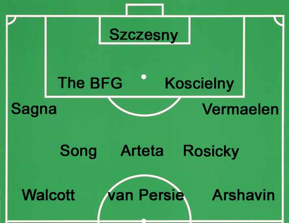 Szczesny, Sagna, Vermaelen, Koscielny, Song, Arteta, Wilshere, Gervinho, Van Persie.