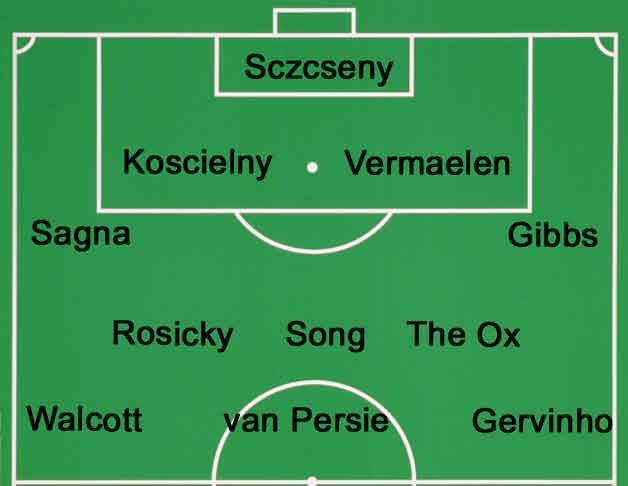 I would play Yennaris or Ozyakop next to Song in midfield, rather than a partly-fit Tomas, and The Ox behind RvP with Gerv and Theo on the wings.