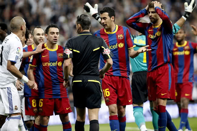 4) The referee calls a foul and suddenly he is surrounded by half a dozen players, usually from the offending team , harassing him (her) and trying to get their 2 cents worth in. Barcelona are famous for this and have made it a new art form called the Catalan cacophony!