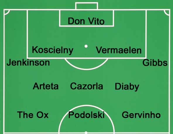Team in full: Mannone, Jenkinson, Koscielny, Vermaelen, Gibbs, Diaby, Arteta, Cazorla, Ramsey, Gervinho, Podolski.