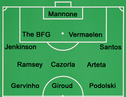 Up front, Arsene Wenger took the revolutionary option of starting with an orthodox striker – Olivier Giroud – supported by Cazorla, with Podolski on the left and Ramsey taking the right-sided midfield role he performed so well against the champions a few weeks ago.