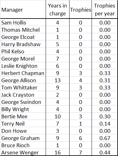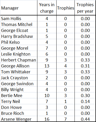 Trophies per year calculation seems silly since up to 1987 Arsenal only had a handful if you take away the 1930s.