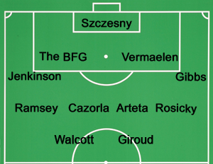 Selection wise I’d rather give the BFG-Kozzer centre back pairing a go, on the the assumption Gibbo is fit and Vermaelen is not needed at left back as I think our captain has had a stinker of a season and needs to be dropped, as has apparently Chesney.
