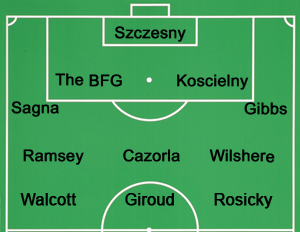 I’d go with Rosicky down the middle, pod out left, and santi off the bench again.