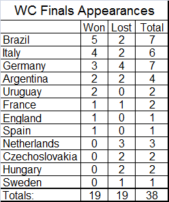 One very interesting thing is your chart of Finalists. With the exception of Uruguay and France, you have to get to the final on a few occasions to actually win it.
