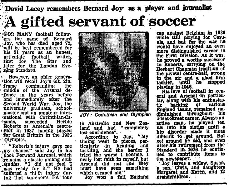 I remember Bernard Joy as the football editor of The London Evening Standard and always had a positive slant on his old club