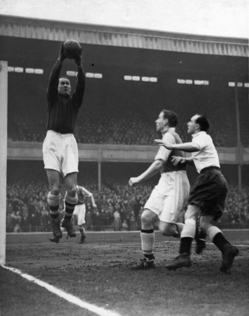 Highbury 1939. Wilson (Arsenal) saves while Bernard Joy (centre) holds off Hunt (Bolton)