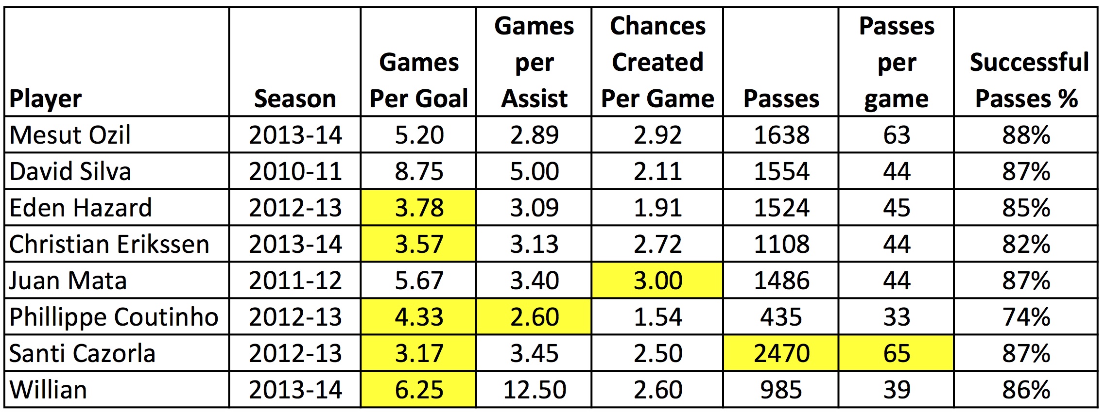 Only three players equalled his number of passes in any of their seasons in the PL, and two play for Arsenal, only three have bettered his pass completion, only two have bettered his games per assist, and perhaps most importantly only two have bettered his chances created per game.