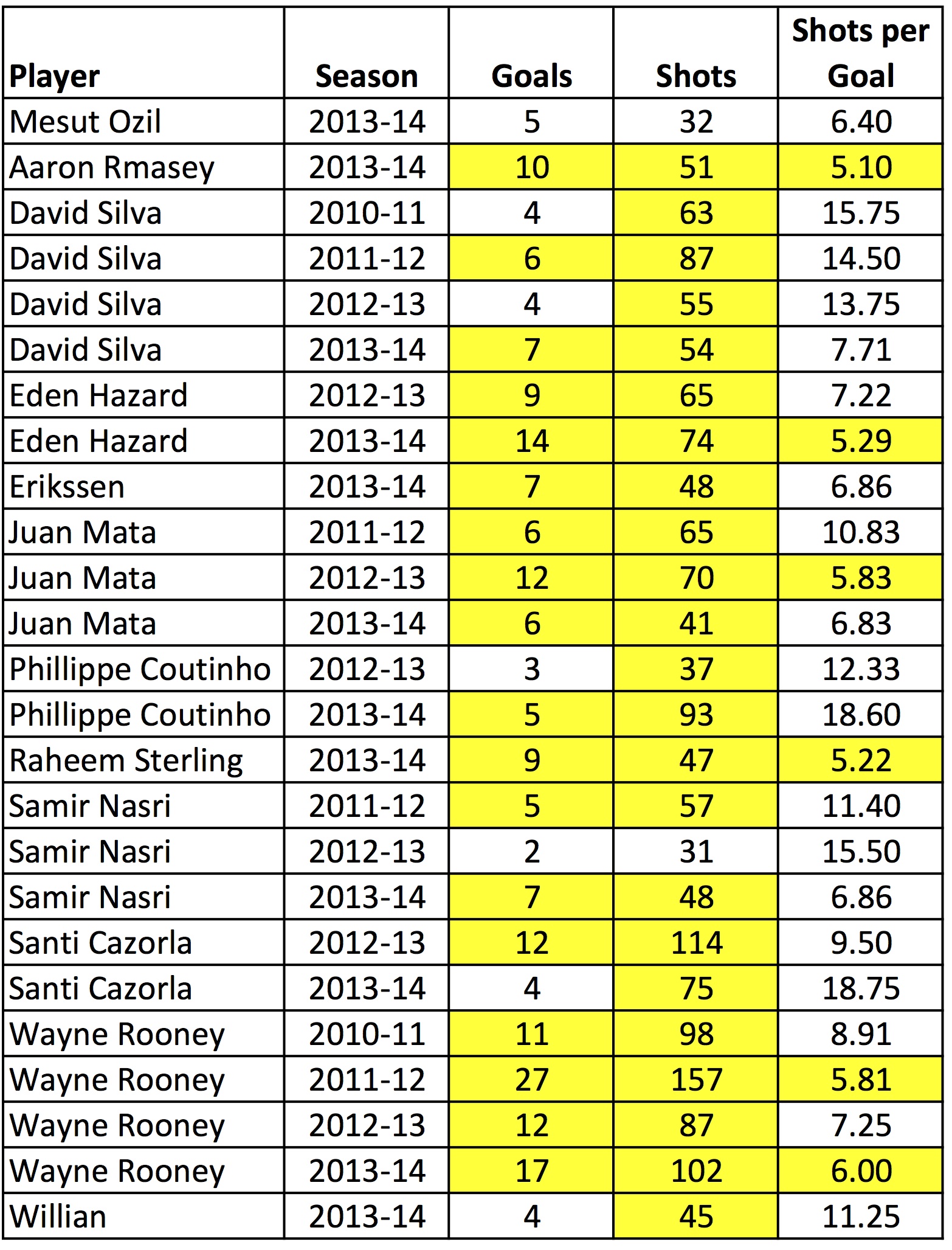 Well, you have convinced me, Exile, it is obvious that Mesut is rubbish and we should buy Mata, Hazard, Silva and that new bloke you list in the ‘goals per shot’ — erm Rmasey.