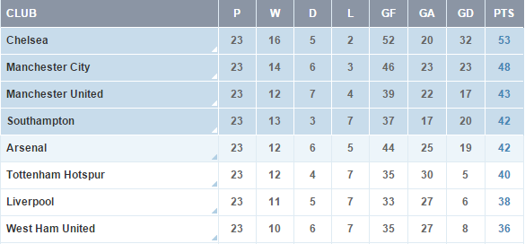After 23 games this season we have 42 points – that’s the same points total as Southampton in 4th, and just 1 behind them on goal difference. We are 1 point behind Utd who are 2 behind us on goal difference. That means that if we win next weekend and Utd and Southampton lose or draw, we go 3rd.
