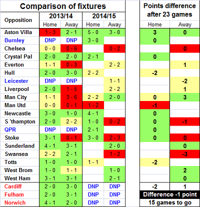 From this you can see that we are 2 points worse off in our home games and 1 point better off in the away fixtures, making a net deficit of just 1 point …. not exactly a disaster.