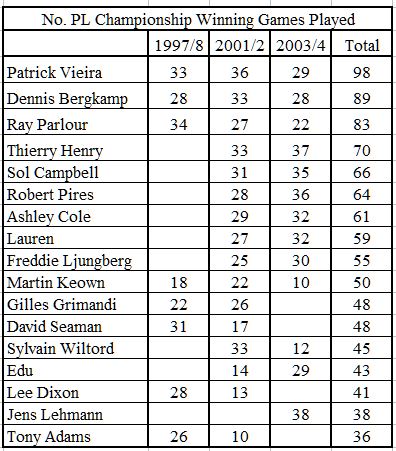 Continuity appears to have played a big part in our 3 Championship years, in 2 of our 3 winning seasons our goalkeepers were dominant – in 1997/8 David Seaman played in 31 games and in 2003/4 Jens Lehmann played all 38 games he was the only player to do so on any of the Championship winning teams.