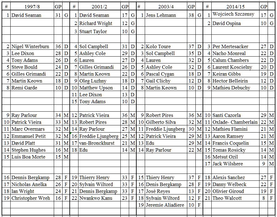 Our mid-fields were dominant with Patrick Vieira and Ray Parlour playing in all 3 teams with Frederick Ljungberg, Robert Pires and Edu being present in 2 of the teams.