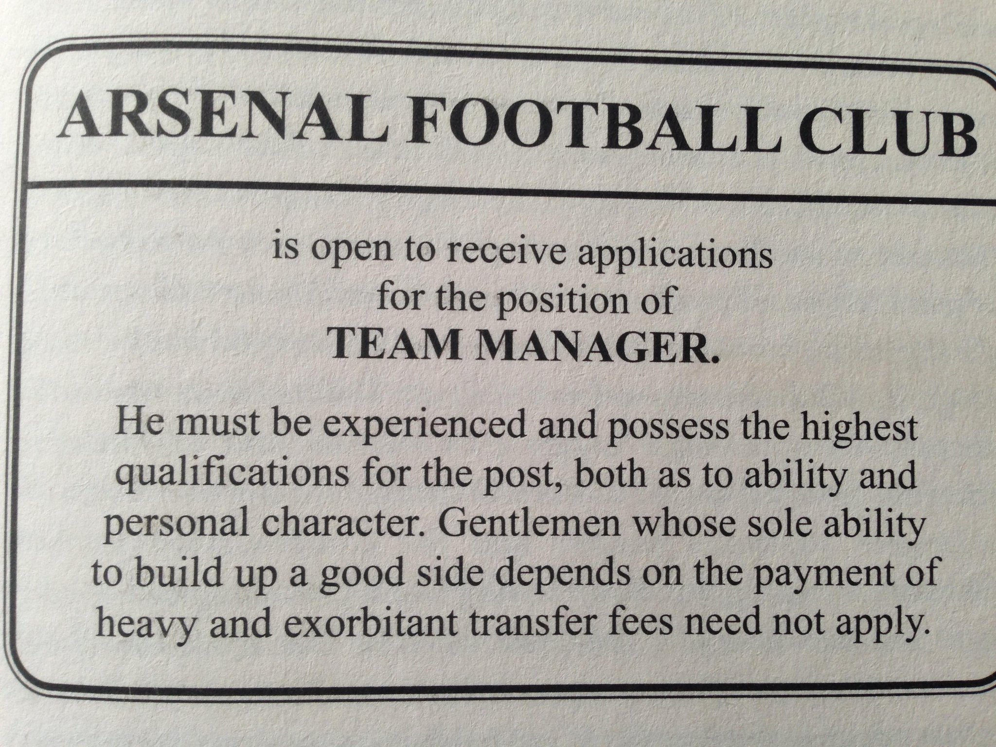 That advert is from the 1930s – originally placed by Sir Henry Norris prior to the appointment of Herbert Chapman.