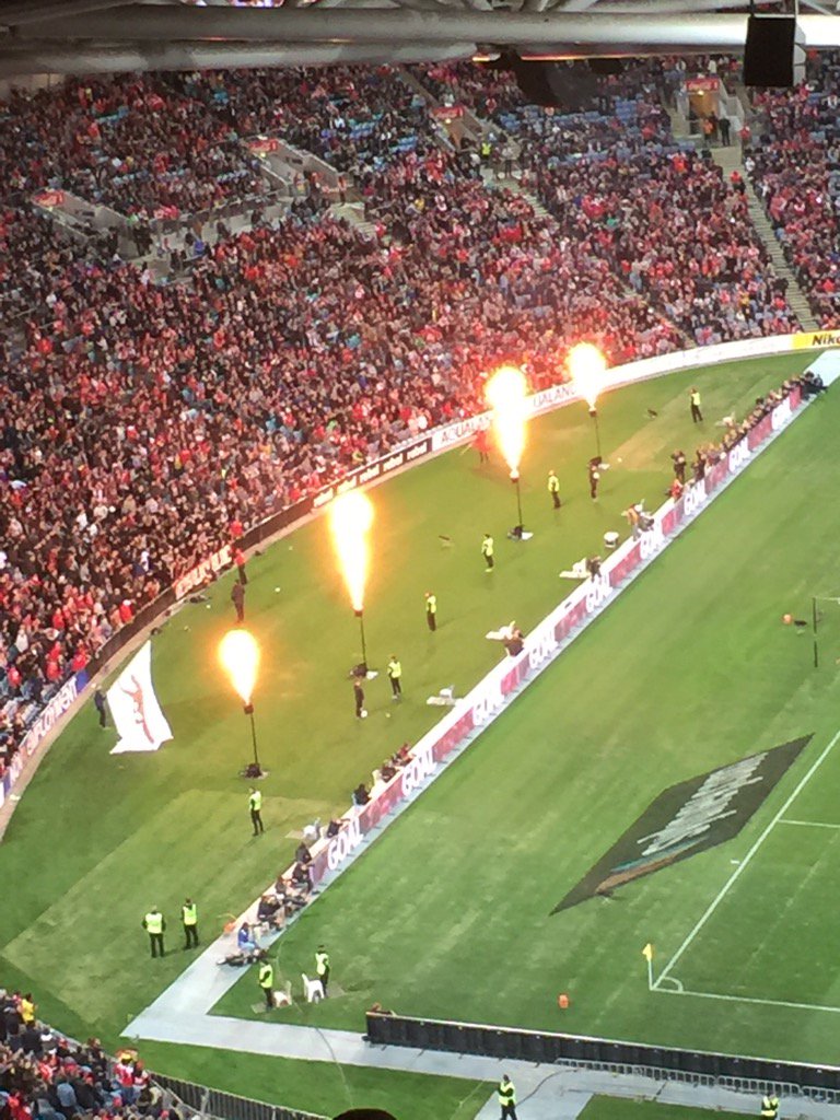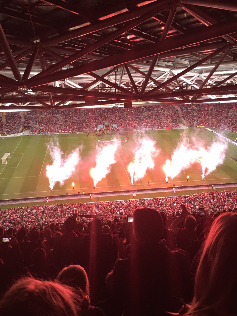 Lots of pyrotechnics after each goal plus big Arsenal flags being waved etc