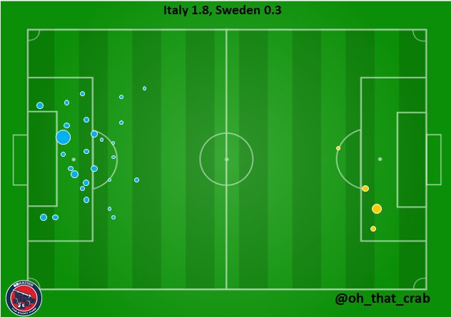 “xG map for Italy – Sweden. The Azzurri got a bunch of shots off, but this is not a performance to get the two or more goals needed.”