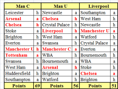 We are reliant on two of the other 3 (pool, chavs and totts) to lose at least 3 games and us to go unbeaten. A tall order. It’s possible.