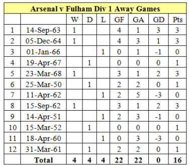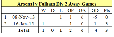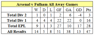 While Fulham have never beaten Arsenal in away games (they have lost 22 tied 5 and been outscored 67 to 23), their home record is a tad better having won 8 tied 5 and lost 14 and were outscored 13 to 38. Their last away win was on Jan 2nd 2012 when they won 2-1.