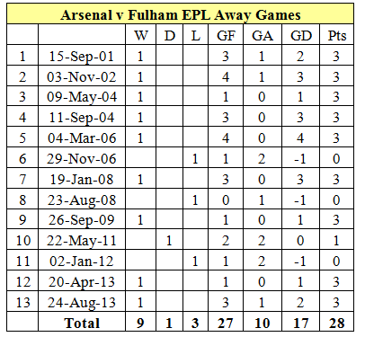 While Fulham have never beaten Arsenal in away games (they have lost 22 tied 5 and been outscored 67 to 23), their home record is a tad better having won 8 tied 5 and lost 14 and were outscored 13 to 38. Their last away win was on Jan 2nd 2012 when they won 2-1.