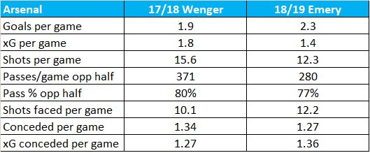Arsenal seemingly worse under Emery than during Wenger’s last season in everything apart from actual goals scored and conceded (and therefore results). It’s enjoyable so far, but if things don’t change there’s probably a correction around the corner.