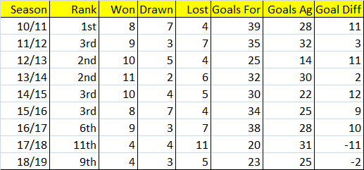 As you can see from the above, our away form ranking was fairly high earlier in the decade; higher in fact than our final League position in many cases. Season 2015/16 was the odd ‘Leicester as champions’ season and our away form ranking was one position lower than our final League position (thanks to the spuds coming third in a two-horse race). 🙂