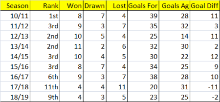 The current season is only 66% complete and we have faced most of the top teams away from home already – so perhaps it is much too early to judge if there’s been an improvement. We currently have a ranking of 9th in terms of away form (having decent home form has kept us in the top 6).