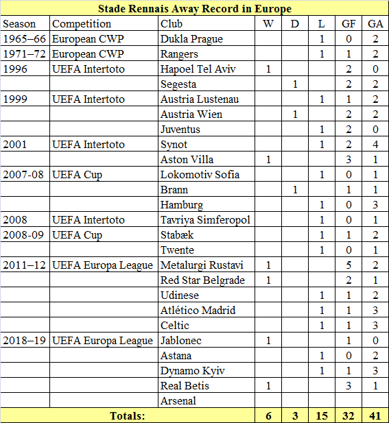 Here is a look at Stade Rennais’ away performances in Europe, I must admit that I’m not positive that the list is 100% correct as I found many differing statistics.