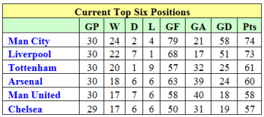 The third through sixth positions are between Spurs, Arsenal, Man U and Chelsea and the four teams are separated by only four points with their final placement in complete doubt.