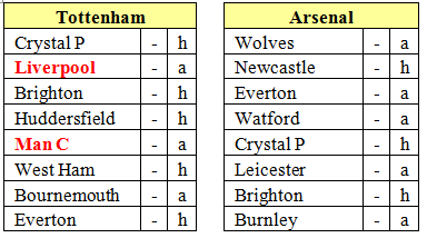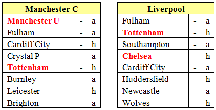 Liverpool has the advantage of playing Tottenham and Chelsea in front of their home supporters at Anfield while Manchester City has the distinct disadvantage of playing Manchester United at Old Trafford.