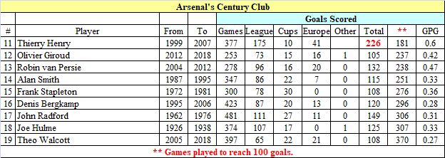 Nineteen players have achieved the feat of scoring 100 goals for the Club over the past 96 years. The players are sorted by the number of games taken to reach the 100 goal mark. Thierry Henry sits at number 11.