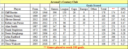 Nineteen players have achieved the feat of scoring 100 goals for the Club over the past 96 years. The players are sorted by the number of games taken to reach the 100 goal mark. Cliff Bastin sits at number 10