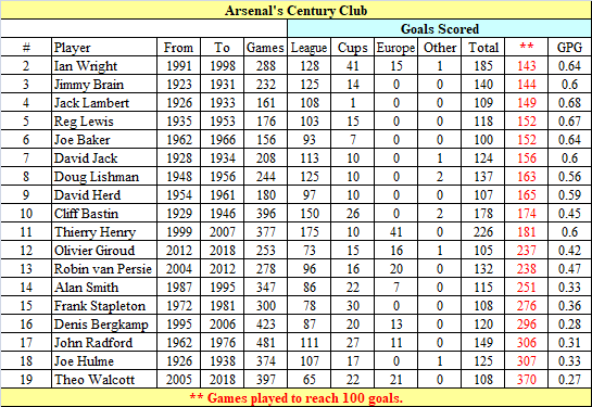 Nineteen players have achieved the feat of scoring 100 goals for the Club over the past 96 years. The players are sorted by the number of games taken to reach the 100 goal mark. Ian Wright sits at number 2.
