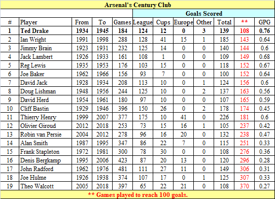 Nineteen players have achieved the feat of scoring 100 goals for the Club over the past 96 years. The players are sorted by the number of games taken to reach the 100 goal mark. Ted Drake sits proudly at number 1.