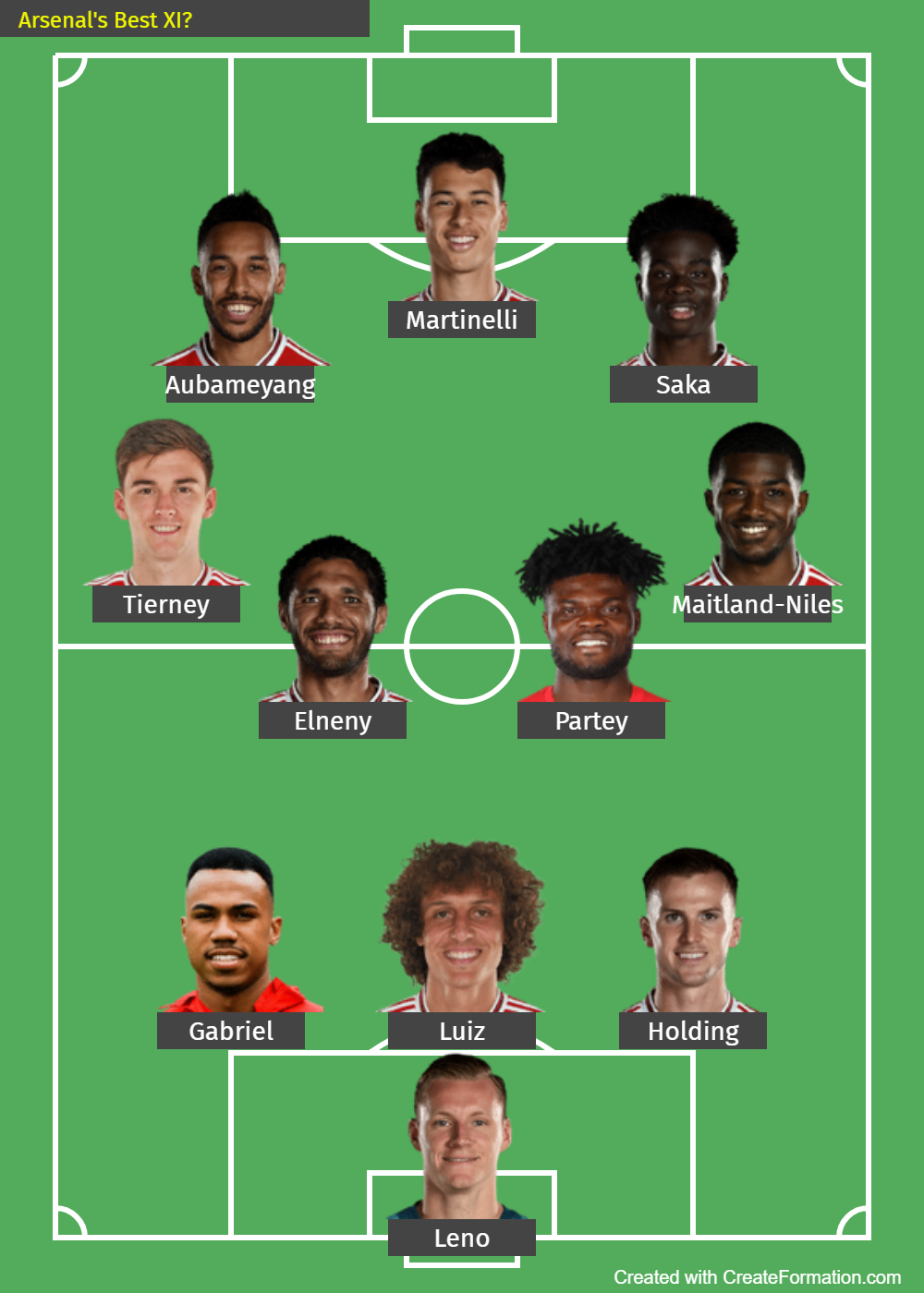 Leno – Holding, Luiz, Gabriel – AMN, Partey, El Neny, Tierney – Saka, Martinelli, Auba
