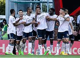 Out of the blocks quickly. Dominating from the off. A miss kicked up-and-under by Benjamin. Gaby J nudges the new boy Senesi off-balance, takes the dropping ball under sublime control and embarks on a mazy, sinuous run into the penalty area. Just when You think he’ll overdo it, a neat side-foot to Gaby M’elli on his outside. Quick control and a fierce shot the goalkeeper can only parry. Odergaard, cleverly, touches the rebound into the back of the net. 1-0.