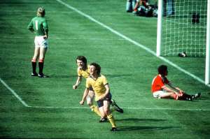 Then everything went mammaries up. In the 86th minute Steve Coppell slung a free-kick across the Arsenal penalty area, Joe Jordan sent it back into the middle, and Gordon McQueen poked the ball home. And just two minutes later, Sammy McIlroy danced past two stumbling defenders and slipped the ball underneath Pat Jennings.