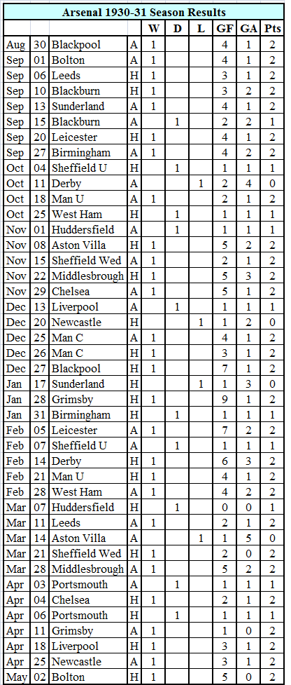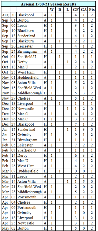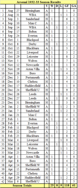 1932-33 turned out to be the final full season that our inspirational and creative manger Herbert Chapman would manage Arsenal; he passed away from pneumonia in January 1934. He had been instrumental in many innovations at Arsenal including getting the local underground station, Gillespie Road renamed to Arsenal, and he also introduced the now famous white sleeves in a match against Liverpool in March 1933.