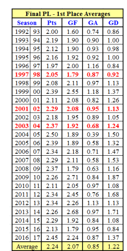To win the Premier League has taken an average of 2.24 points per game, goals for of 2.07 and goals against of .85. Arsenal’s average has been 1.87 points, 1.75 goals for, and .96 goals against.