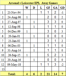 Our away record against Leicester in the EPL has been favourable only losing twice in twelve visits, one of which was our last visit in May 9th, 2018 when we lost 3-1.