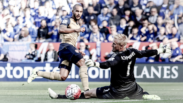 Walcott slides the ball past Schmeichel in the 5-2 demolition of September 2015 during their title-winning season