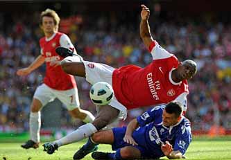 But, hold on, that was not Rambo I was envisioning, it was Dudu, smashed by Taylor; but no, oh God, no, it was neither, it was Diaby, with his ankle apparently sheared off at Sunderland. Wasn’t it?