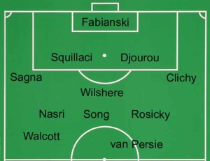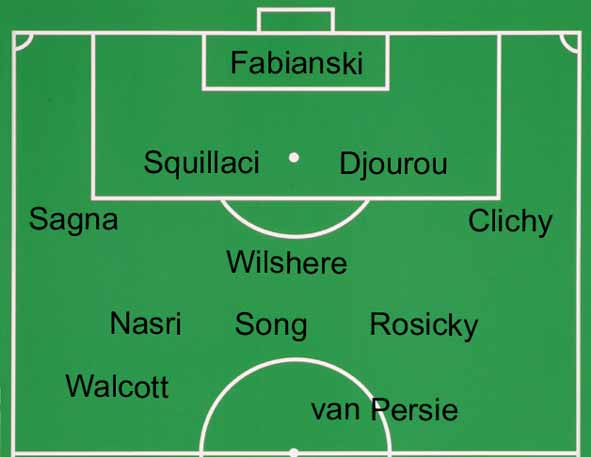 At last we are getting back to a full squad. There are rumours of Diaby’s return to fitness, though he will need some pitch time to regain his sharpness. I know he is not to everyone’s taste but I believe he has all the qualities to be a valuable squad member. Theo, Nik, and RvP are vying for a start. For me the experiment of playing RvP as a deep lying forward in the DB10 mode is not working and needs to be abandoned. I want to see Robin leading the line and as such would give Chamakh a 70 minute rest.