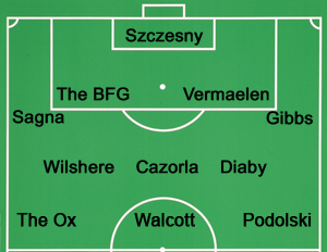 If we were at home Walcott should start but Ox gives us more security in defence (or does he??) in an away fixture. We have an excellent attacking bench and Bellerin. You may have noticed an absence of Cazorla – I think he needs a rest.