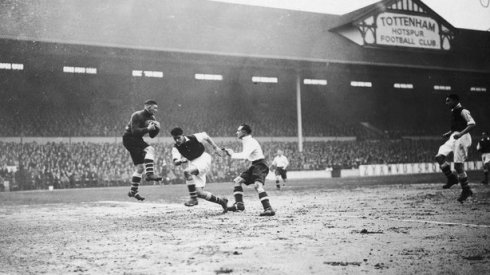 The next glorious day out down Tottenham High Road came on 6th March 1935 in the fourth of our 1930s title winning seasons. Spurs decided that to curb Arsenal’s free-scoring forward line, they needed to set an offside-trap. It failed, they lost 6-0 with goals from Kirchen (2), Drake (2), Dougall and Bastin from the penalty spot. The only photo of that game emerging from a quick search is this of Frank Moss gathering the ball from a rare Tottenham attack (perhaps the photographer was a spud as he must have been stationed at the wrong end of the stadium!)