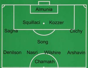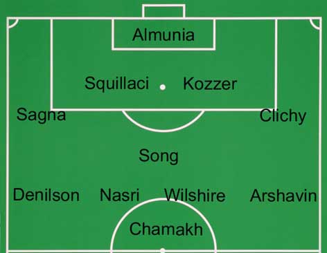 Clichy and Song both tried long distance shots with predictable results. (With Clichy’s goal record he should be under strict orders NEVER to shoot from distance – it just wastes an attacking move).